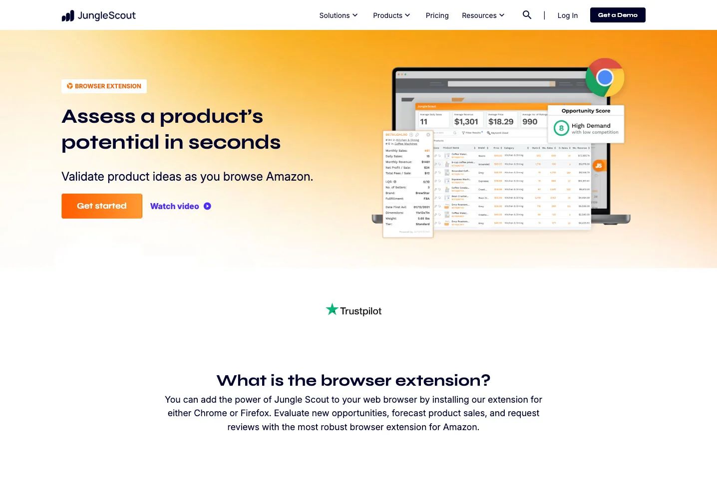 Jungle Scout’s Chrome extension sits just below Helium 10 on my list because it nails speed and simplicity without drowning you in knobs and charts. You get the core signals that matter for go-or-no-go calls in seconds: sales and revenue estimates, review counts, pricing, and quick profit math. It plugs smoothly into Jungle Scout’s toolkit when you want to track products or expand keyword research, and the price is friendly for solo sellers. You lose some of the deeper reverse ASIN and on-page granularity you get with Helium 10, but for fast, confident validation with a lighter feel, Jungle Scout is hard to beat.